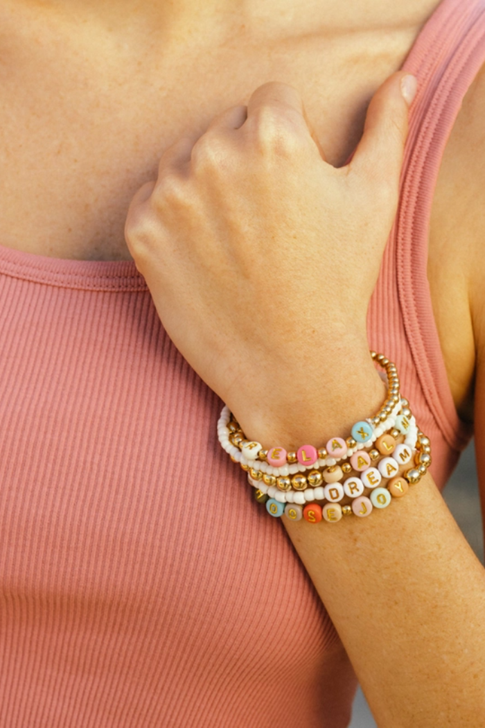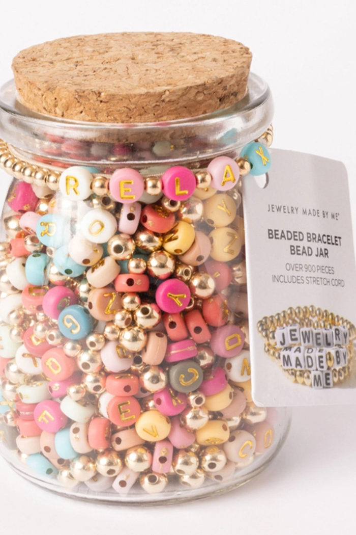 Let the chill vibes flow, RELAX, it's easy to create your own stretch word bracelet. Bead jar includes Multicolor pink, hot pink, turquoise, yellow, orange, and white with metallic gold letter alphabet beads and small gold round spacer beads. Make and trade friendship bracelets with the Original Bead Jar™. The Relax stretch bracelet DIY bead kit includes over 100 grams of beads and 5 yards of stretch cord in an eco-conscious reusable glass jar with a cork lid.