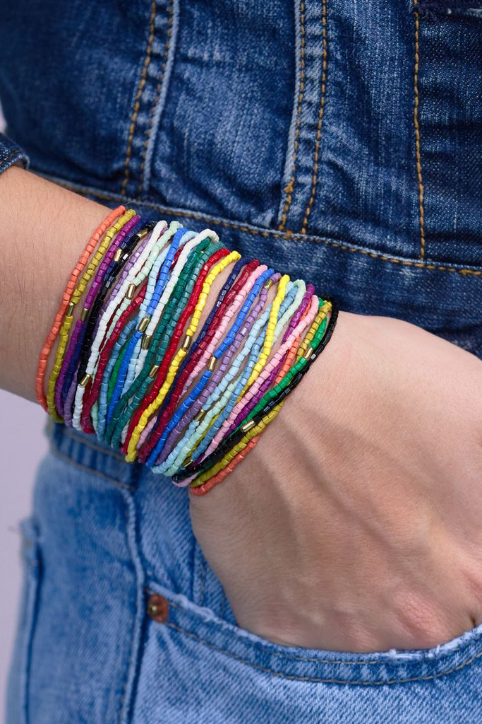 Every bracelet is meticulously hand-strung by skilled artisans, resulting in miniature works of wearable art designed to highlight your fierce, individualistic flair. The stretch fit allows each strand to hug your wrist with comfortable ease as you dance through life's vibrant adventures. Whether you're making a statement at a summer music festival or punching up an elevated weekend look, the Chelsea bracelet set is guaranteed to be the center of attention.