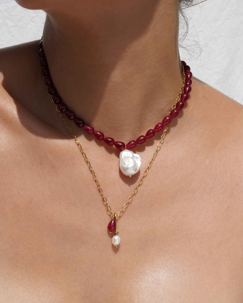 A gold-tone chain with mixed charms gives off a modern, polished look in this Lissa Necklace. The design features a rectangular link pendant with a white pearl drop and a red teardrop charm for subtle contrast. Kozakh crafted this piece to work equally well with everyday looks or elevated evening outfits.