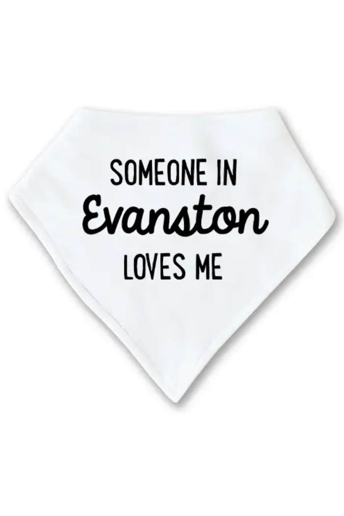 A soft white bandana-style baby bib printed with “Someone In Evanston Loves Me.” The Someone In Evanston Loves Me Bib from Rock Scissor Paper is an absorbent, lightweight bib with a tapered point for stylish dribble protection. It’s designed for everyday wear and easy fastening at the neck for a secure fit while feeding or teething.