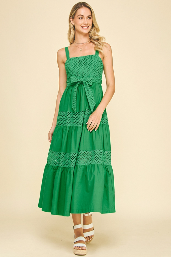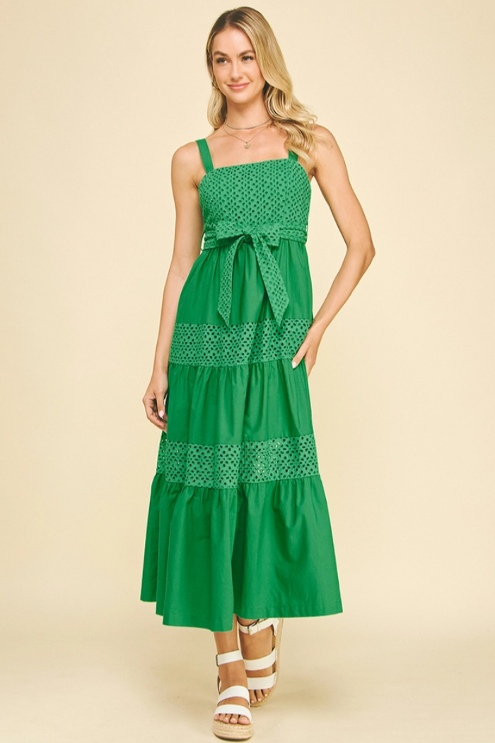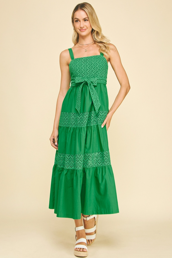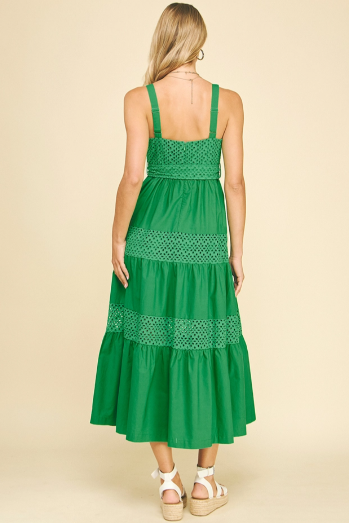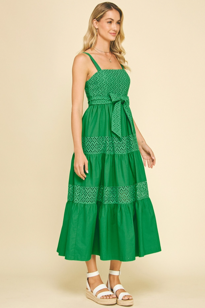 This vibrant emerald green maxi dress features beautiful eyelet lace detailing throughout that creates stunning texture and visual interest against the solid fabric panels. The flattering smocked bodice with adjustable shoulder straps and tie waist belt creates a perfectly fitted silhouette, while the tiered skirt flows gracefully to midi length. Perfect for summer occasions, this feminine dress combines romantic bohemian style with fresh, eye-catching color that's sure to turn heads.