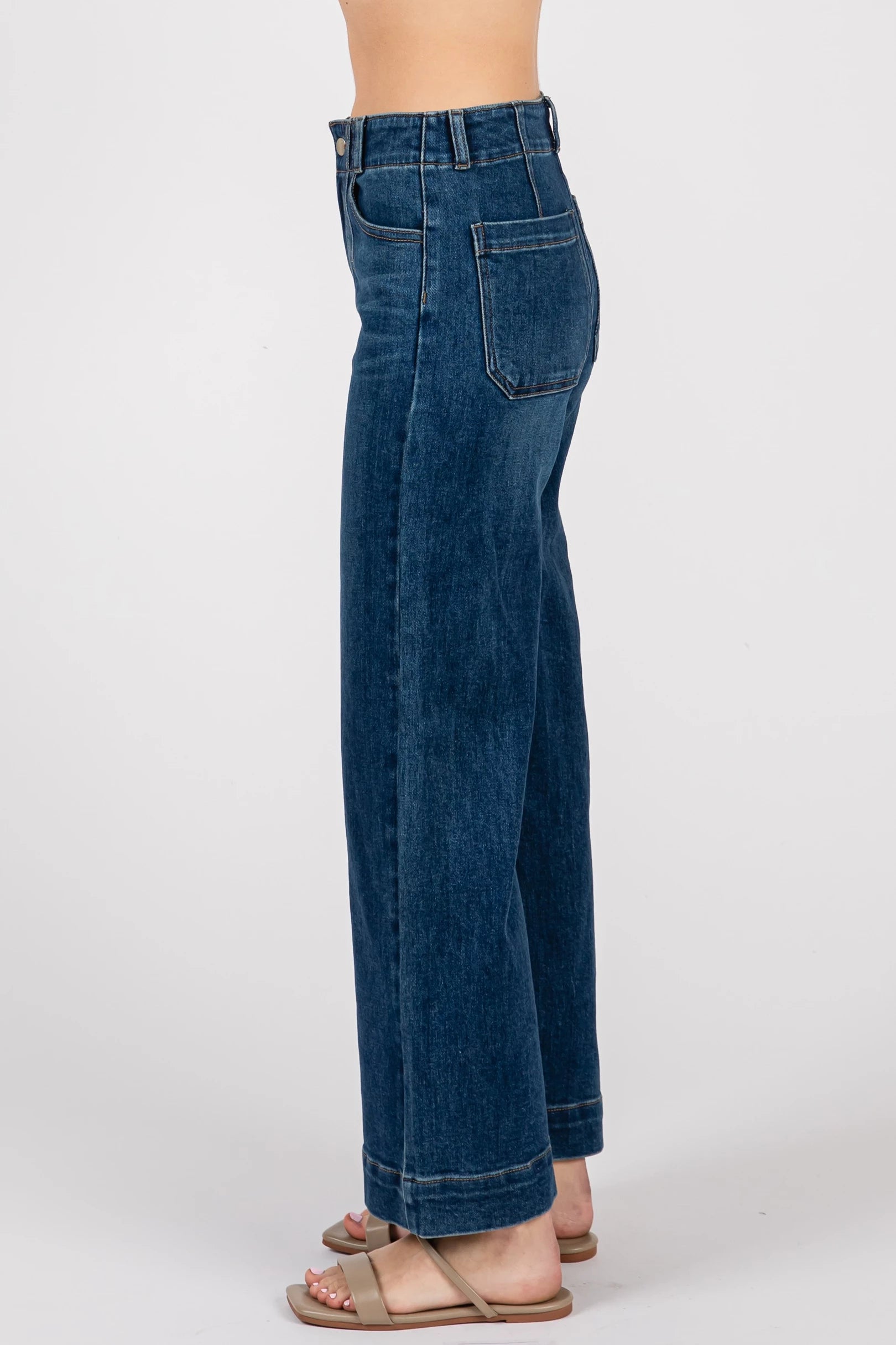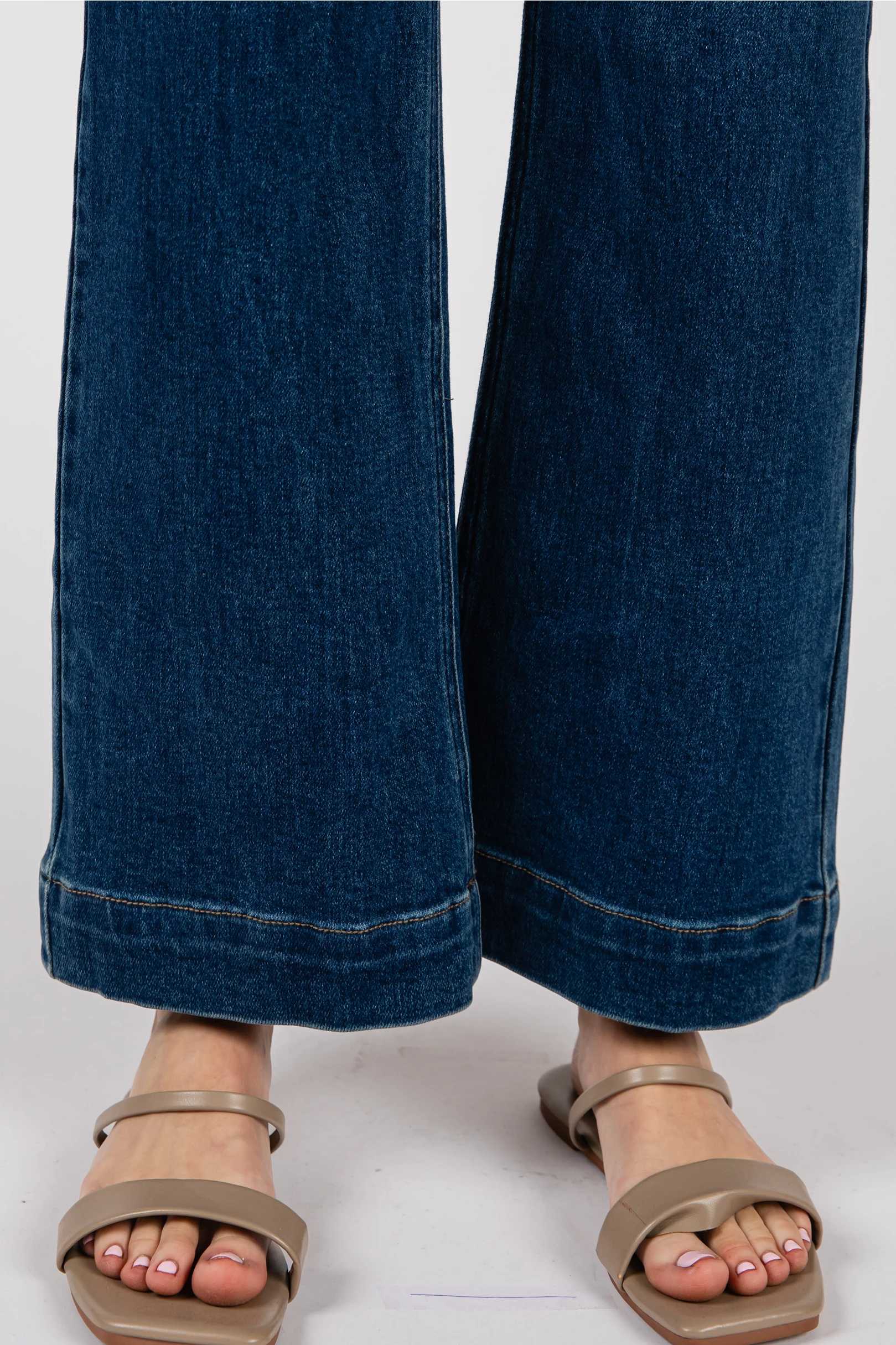Retro-inspired wide leg jeans in rich dark wash featuring a distinctive released hem detail that adds a modern twist to the classic '70s silhouette. The high-rise fit and 27" inseam create the perfect ankle-grazing length for fall, ideal for showcasing booties or loafers as temperatures drop. These versatile jeans offer subtle whiskering through the thighs and that coveted vintage-inspired wide leg shape, making them a stylish alternative to standard denim that transitions seamlessly from casual weekends to polished workwear.