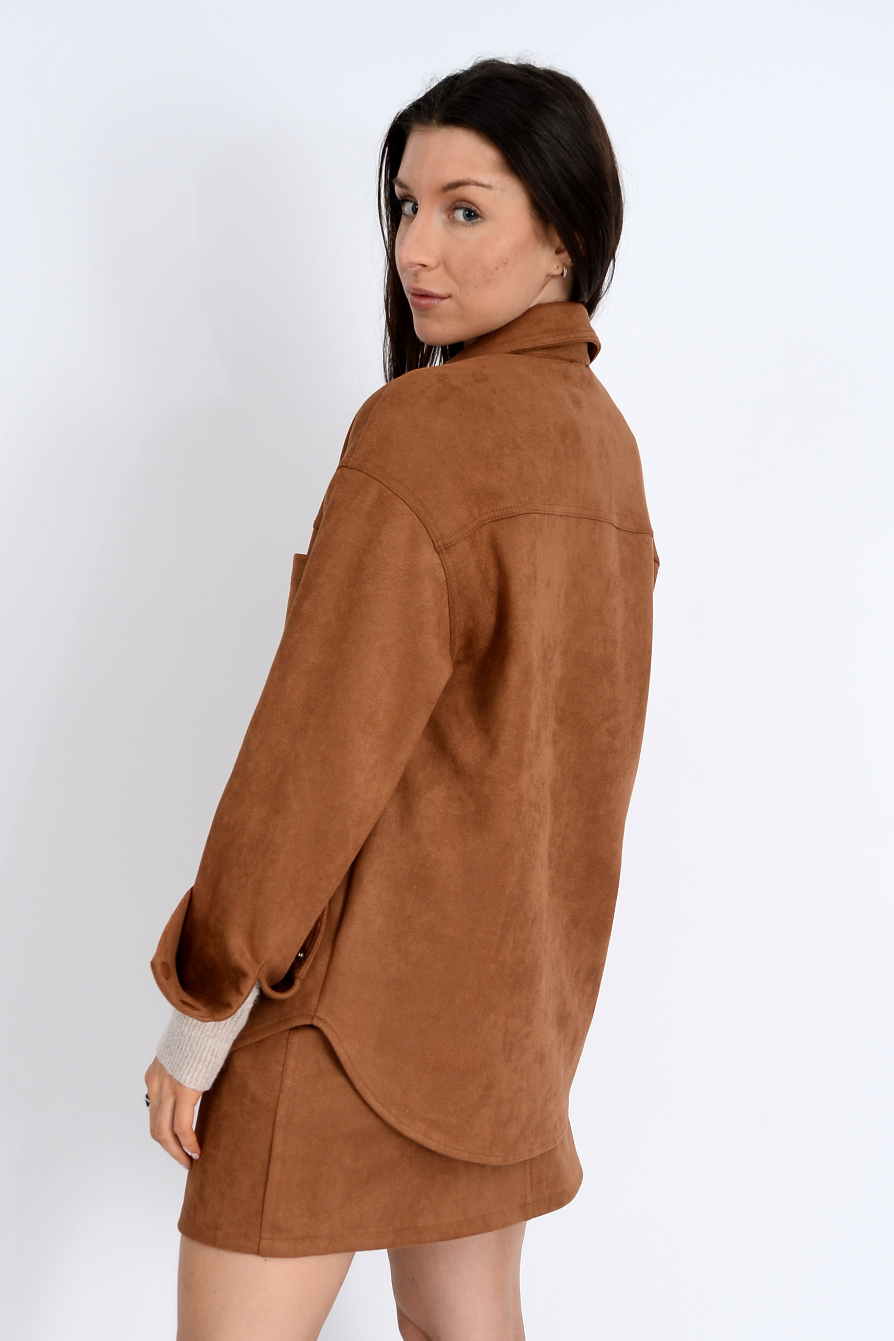 Modern utility shacket in warm caramel brown crafted from luxe faux suede that adds rich texture and elevated sophistication to the workwear-inspired design. The oversized fit features convenient snap-front closure for effortless layering, along with functional chest pockets that maintain the utilitarian aesthetic. This versatile piece transitions seamlessly through seasons—wear it snapped up that showcases the buttery-soft faux suede texture, or leave it open over knits and tees as a lightweight jacket layer that brings both comfort and style to your fall wardrobe.