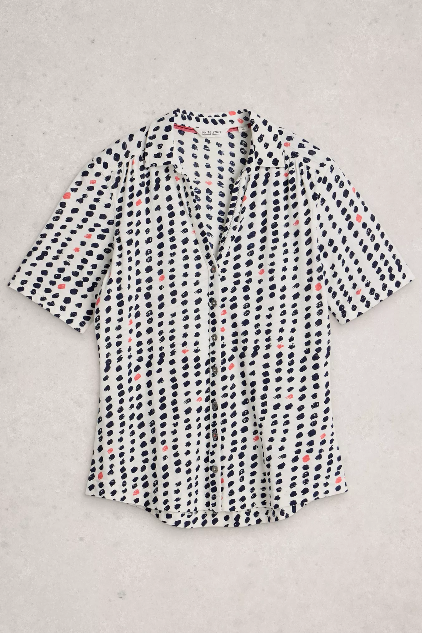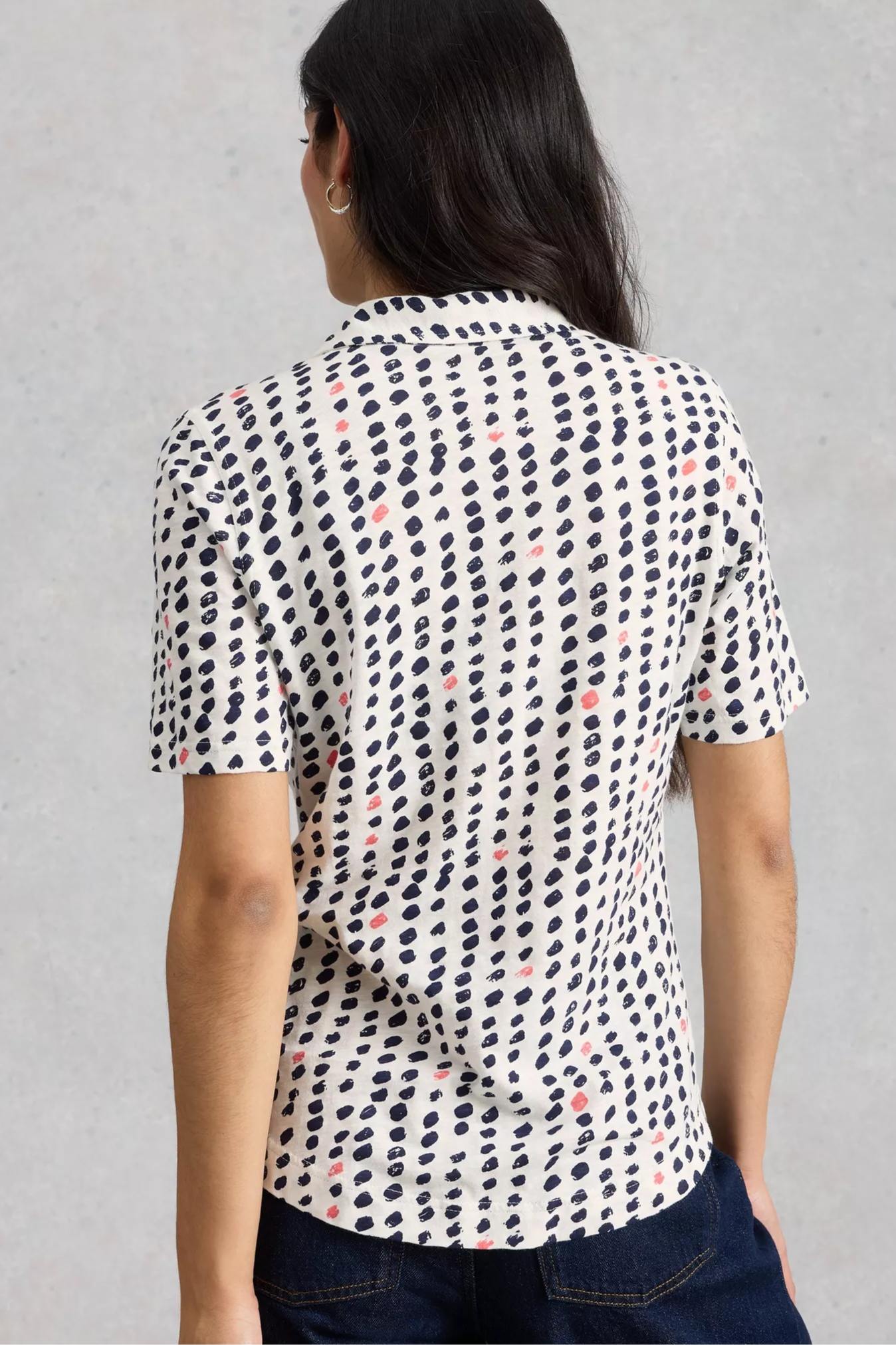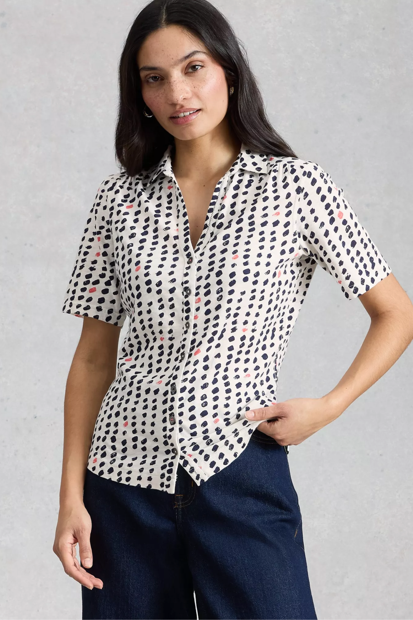 The Anne Jersey Short Sleeve Collared Shirt is a lightweight, button-front jersey blouse cut with a classic shirt collar and short sleeves. It has a relaxed, slightly tailored silhouette and a playful dotted print that dresses easily for daytime wear. White Stuff brings a casual-meets-polished feel to wardrobe staples with this soft, breathable fabric and simple shaping. Pair it with denim or tailored trousers for a smart-casual look.