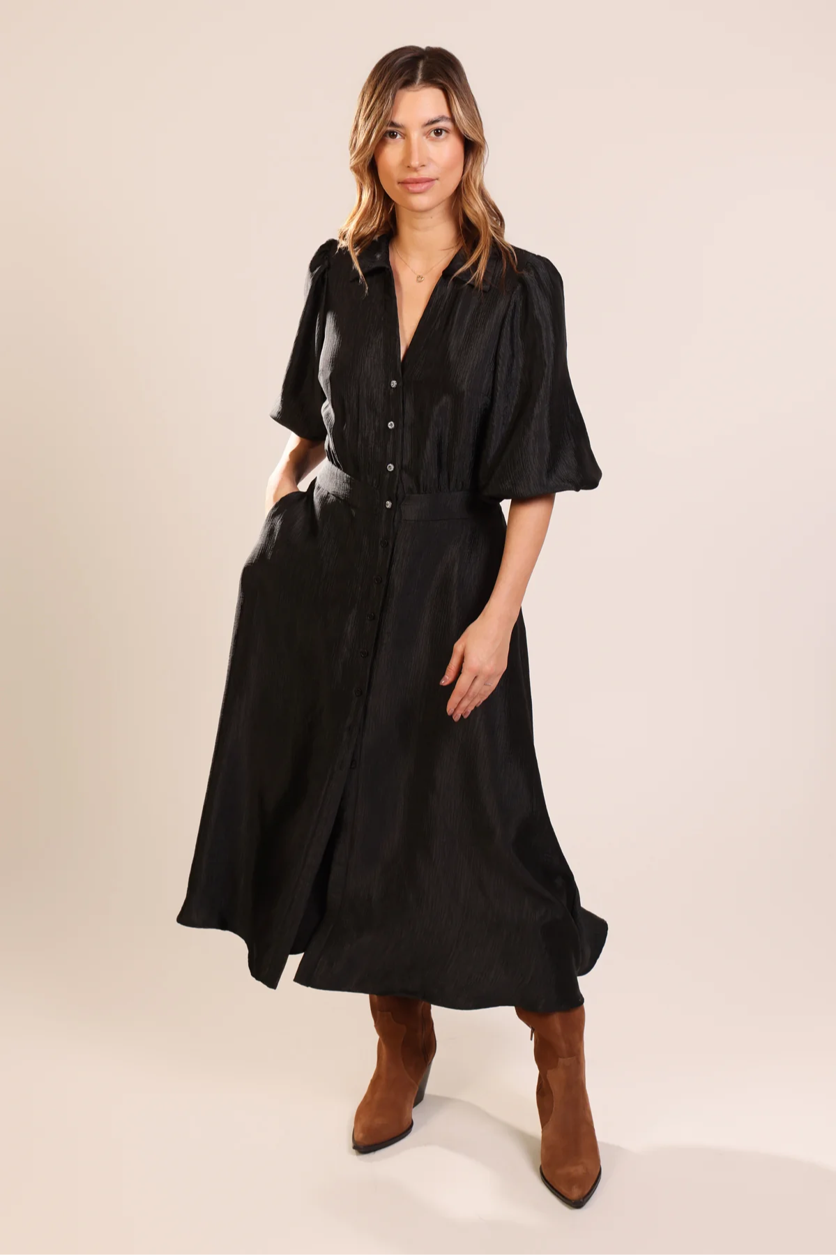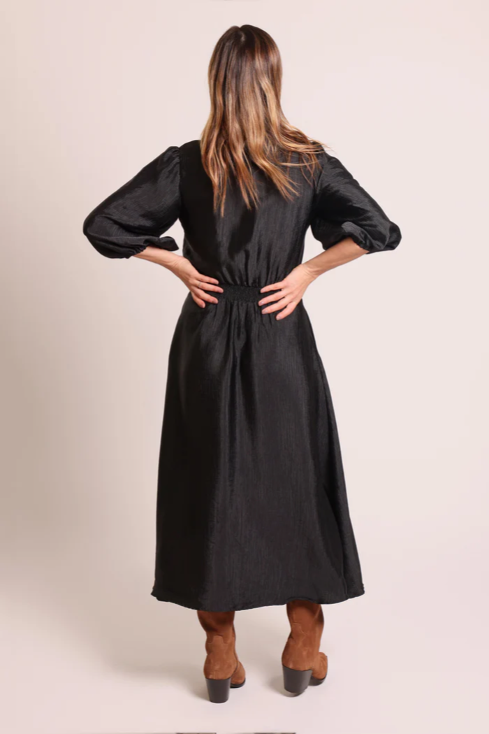 A beautiful midi dress which can easily be dressed up or down for all occasions. Featuring a V-Neck shirt collar, a button front opening, 3/4 billow sleeves, and a belt waist detail which cinches in the waist. Simply stunning in this smooth black fabric.