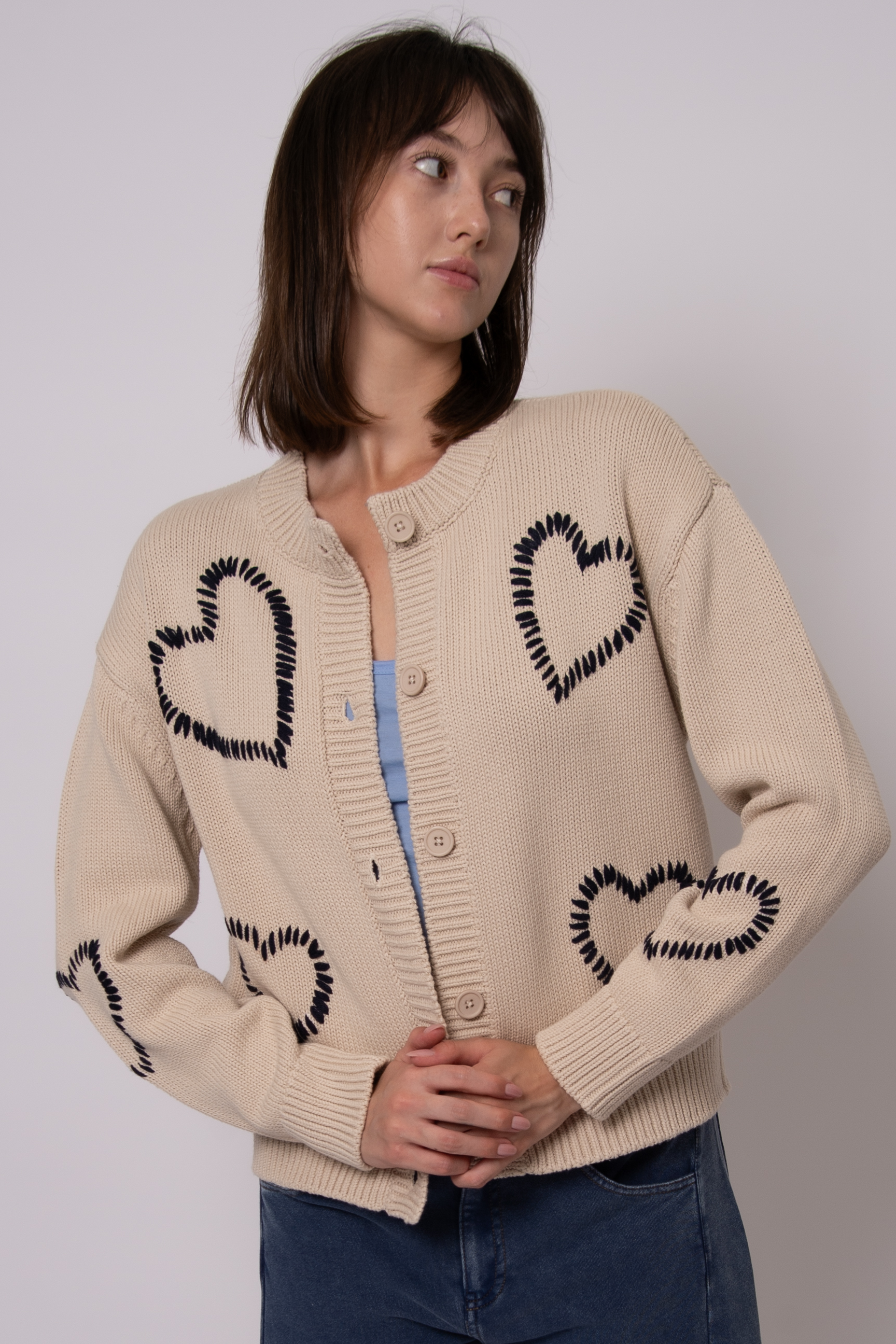 The Asha Long Sleeve Heart Crew Neck Cardigan is a button-front knit cardigan patterned with contrasting stitched heart motifs for a playful, cozy look. It features a classic crew neckline and long sleeves for easy layering. RD Style gives this relaxed silhouette a casual, at-home vibe that pairs effortlessly with denim or lounge pieces.