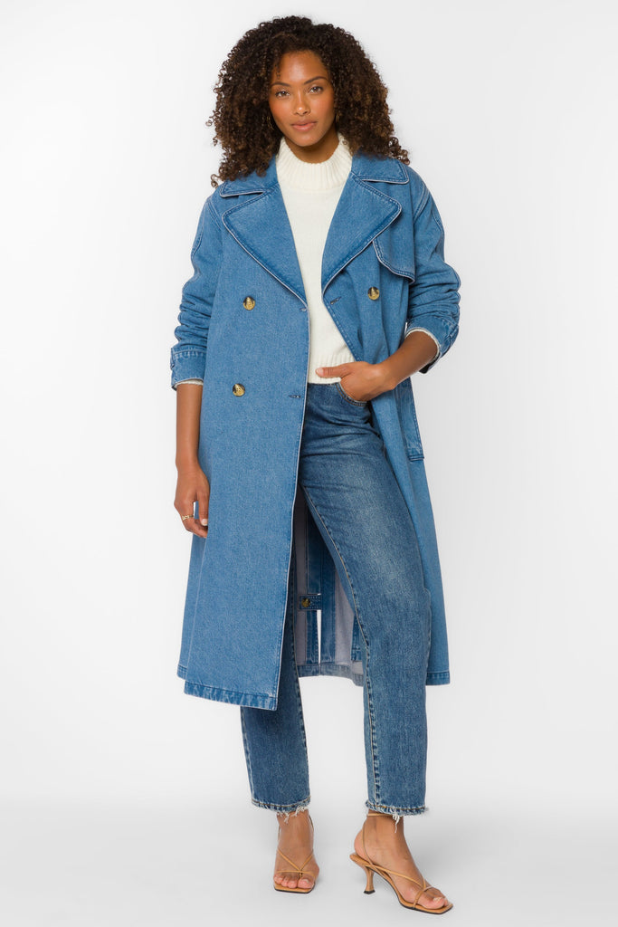 The Banks Trench Coat is a timeless wardrobe staple with a modern twist. This long-sleeve, double-breasted denim trench features a self-tie belt for a flattering fit. Crafted from soft, durable denim, it offers both structure and ease, making it a versatile layering piece for any season.