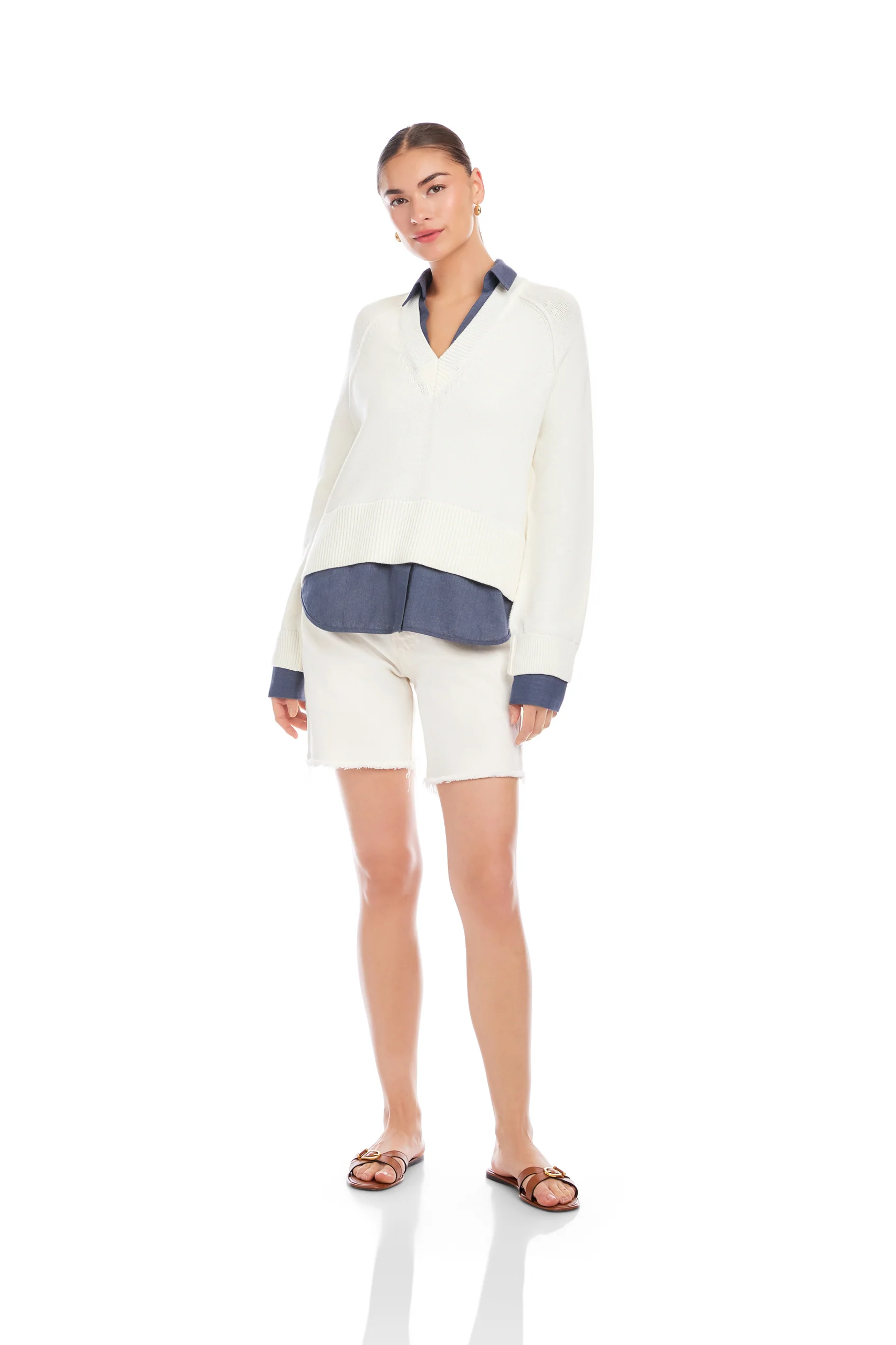 Relaxed, easy silhouette with a faux-layer design that provides comfortable room through the shoulders and body.