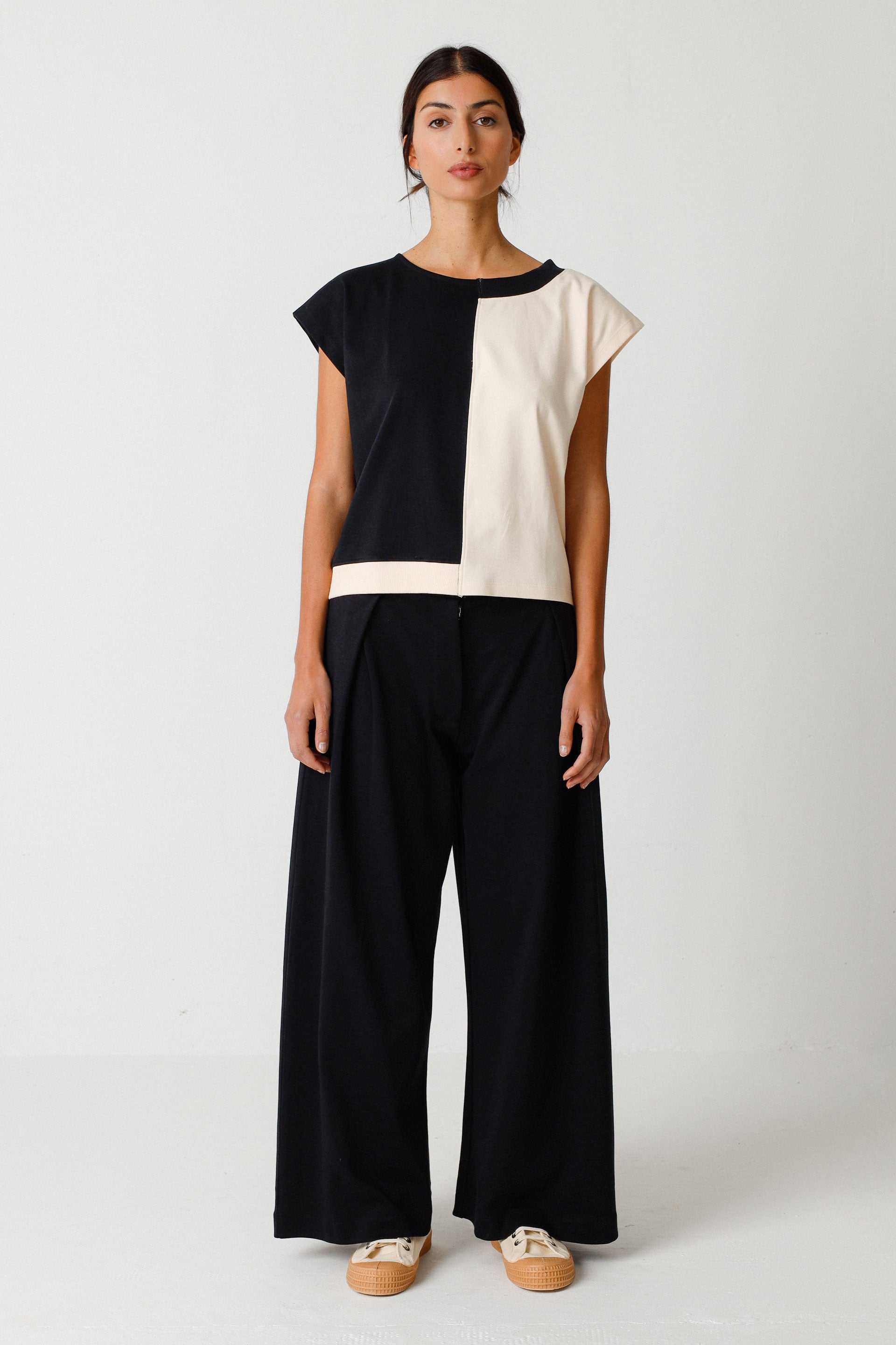 A relaxed colorblock tee with a boxy silhouette and signature shoulder detail. The Ekai Tee pairs a soft knit feel with a modern, split black-and-cream design for easy layering. SKFK offers a contemporary take on a staple tee that reads casual yet refined. Wear it with wide-leg trousers or tailored shorts for an elevated everyday look.