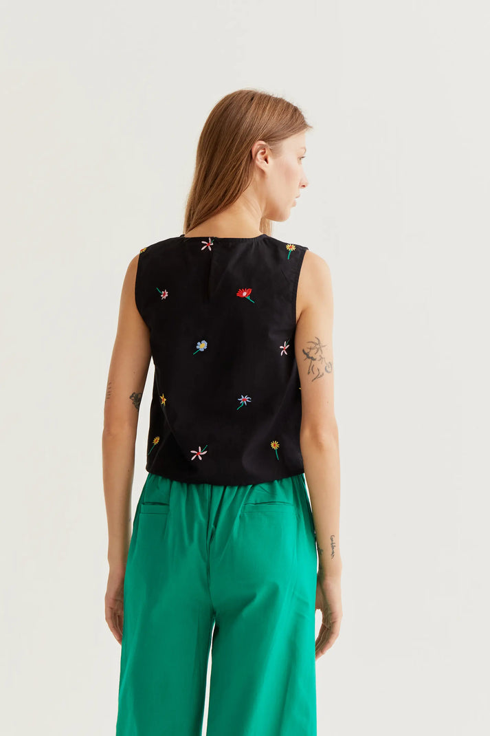 The Flowers Print Tank Top is a sleeveless, cropped tank with a boxy silhouette and dainty scattered floral motifs. Its simple round neckline and clean lines give it a modern, easygoing feel. This piece from Compania Fantastica layers well for casual days or warm-weather outings. Pair it with high-waisted trousers or a skirt for a fresh, relaxed look.