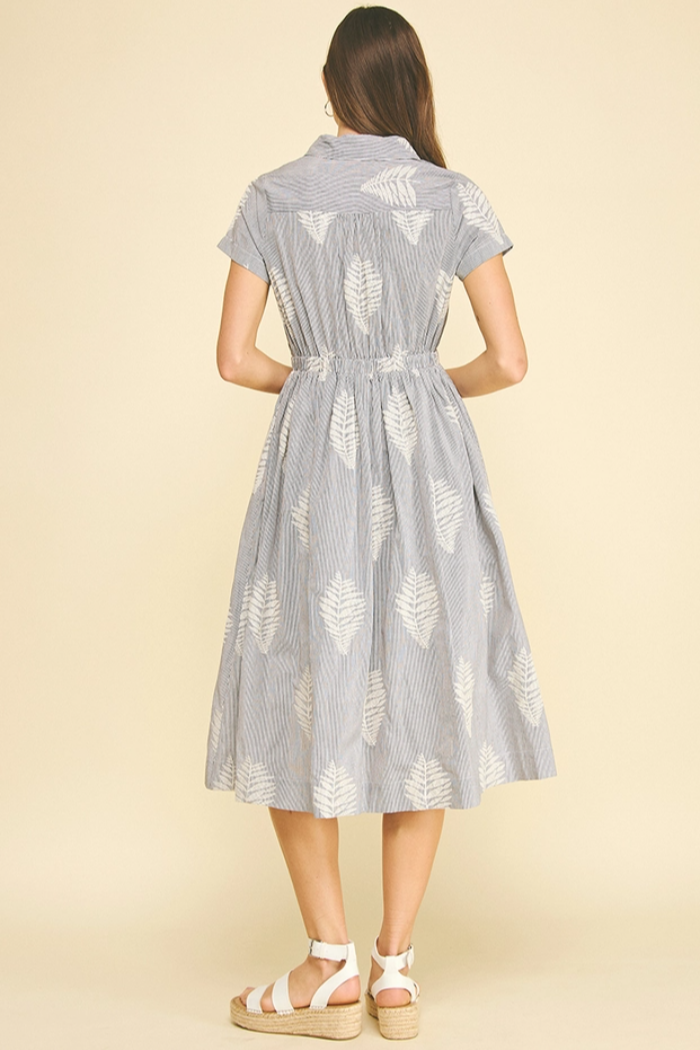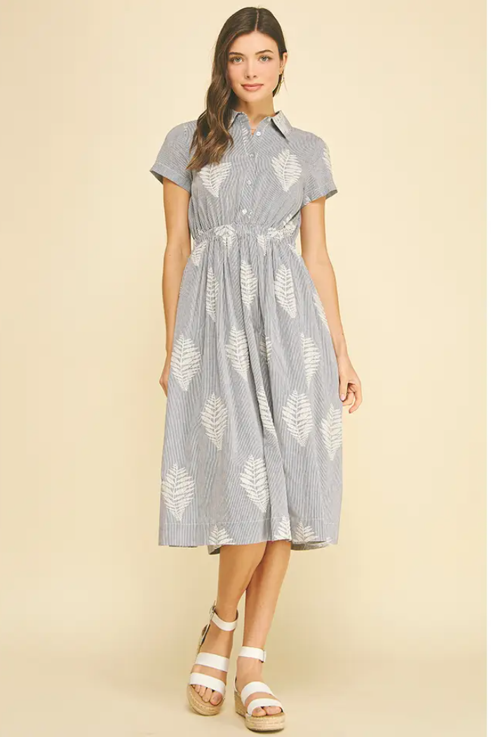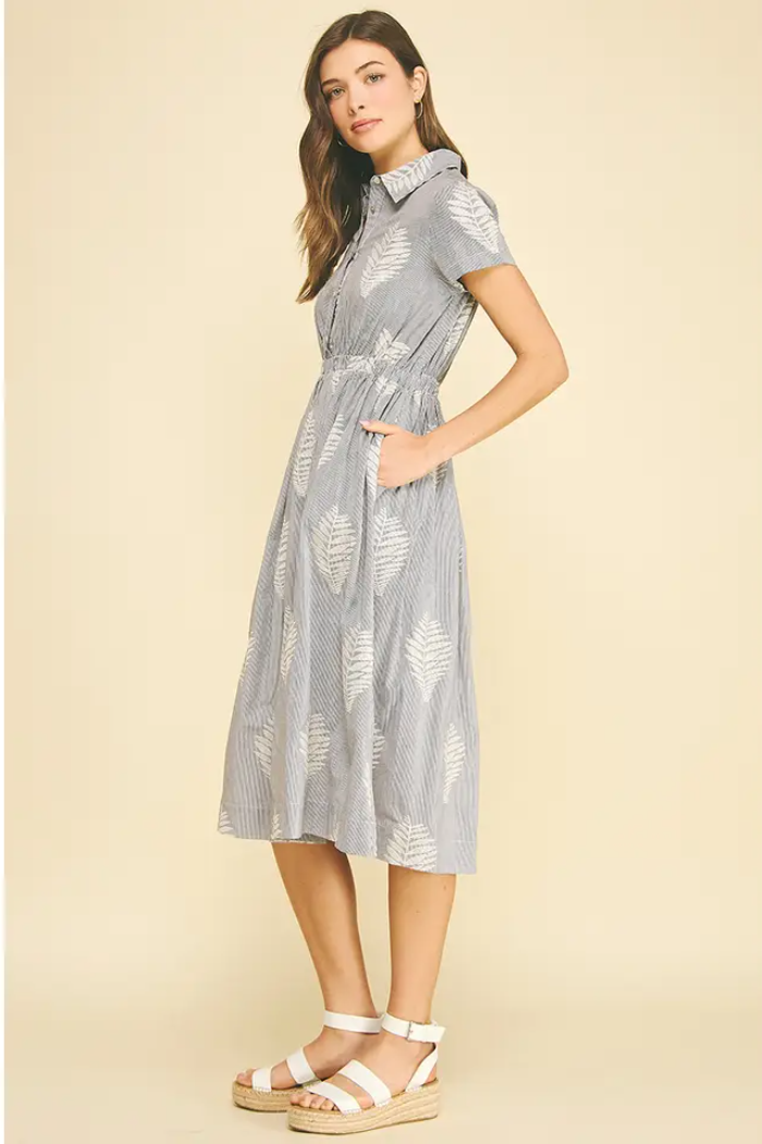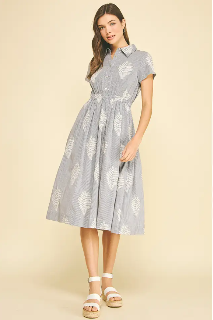 A breezy embroidered shirt-style midi with a gathered waist and delicate leaf motifs. The Lottie Leaf Embroidered Midi Dress from Pinch is made in a lightweight woven with button-front detailing and short sleeves for warm-weather ease. Its relaxed silhouette and tonal embroidery make it perfect for casual weekends or vacation days, while the collared neckline keeps the look polished.