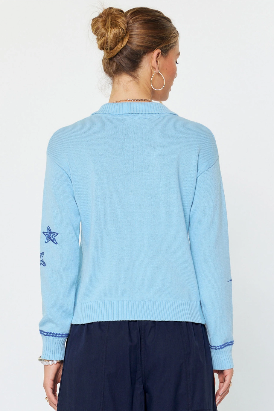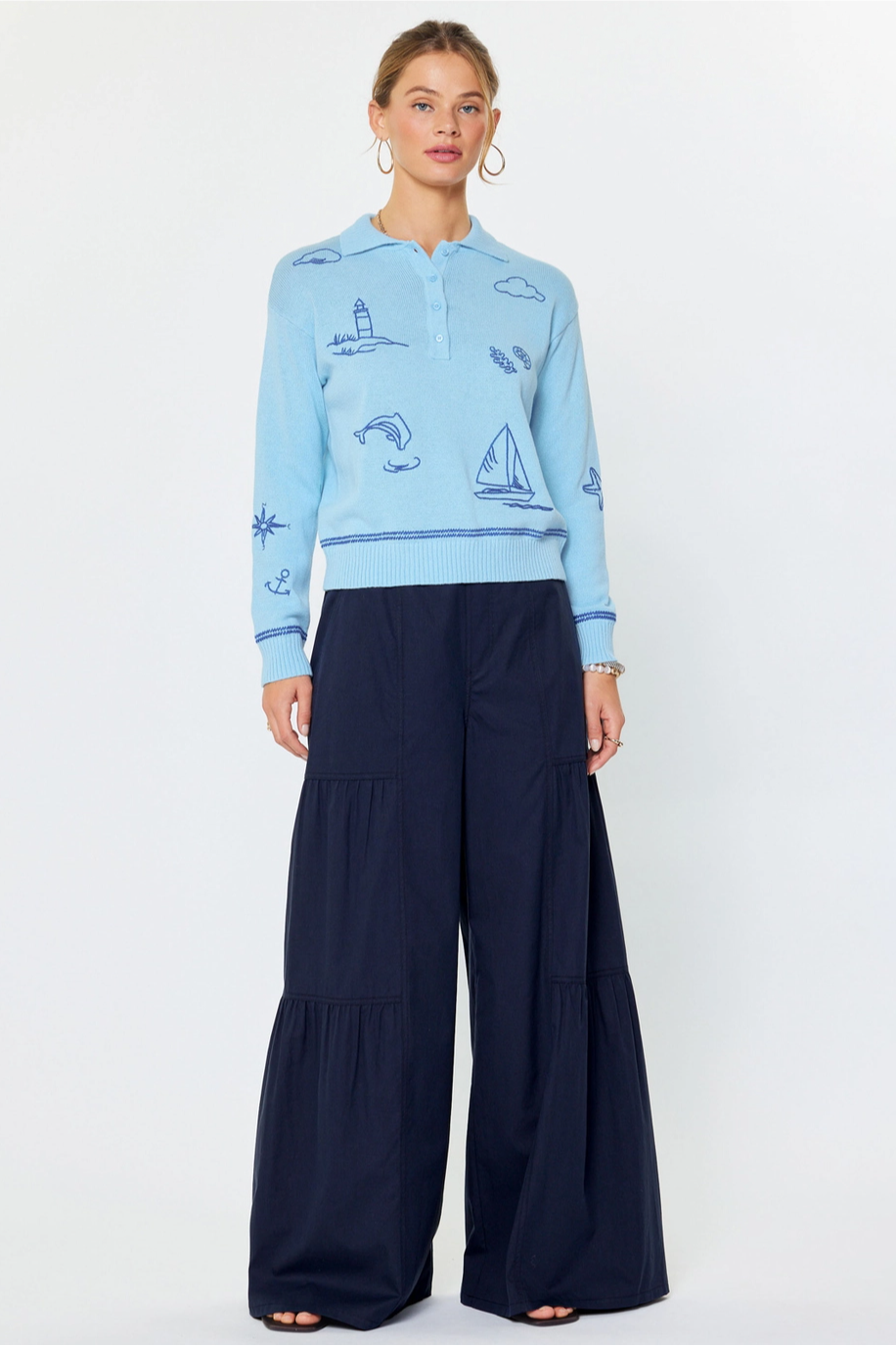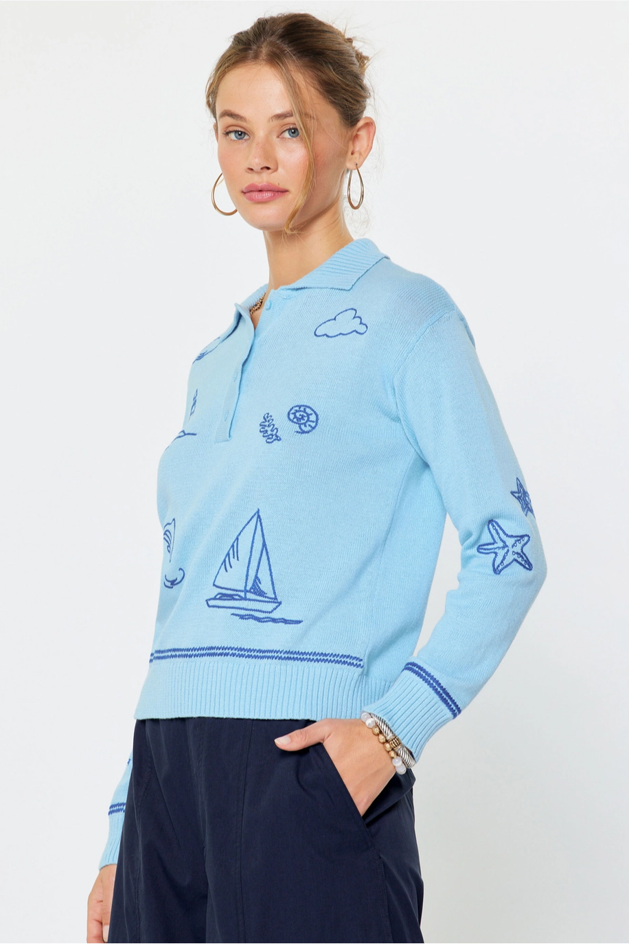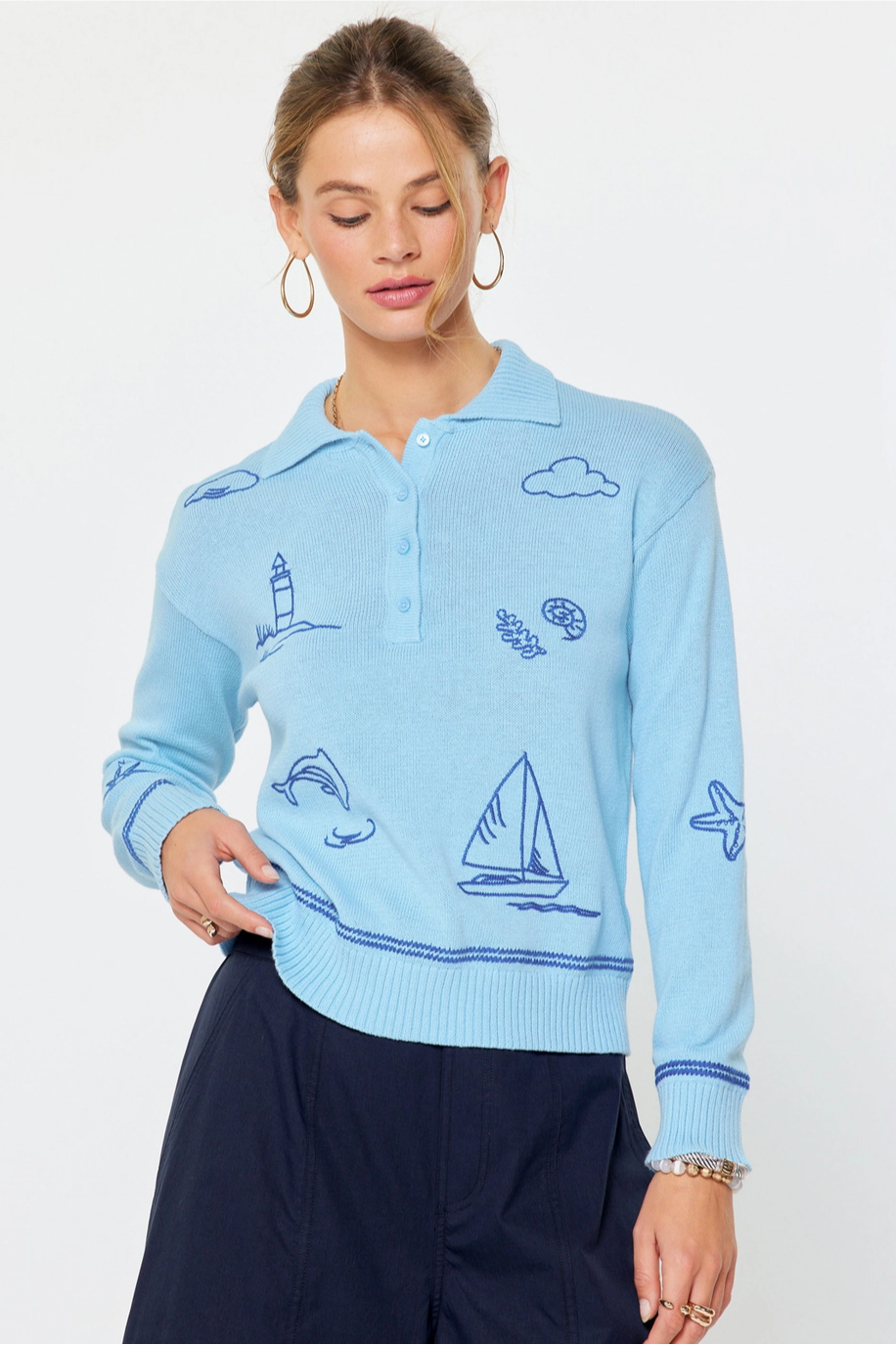 Nautical Embroidered Long-Sleeve Polo Sweater