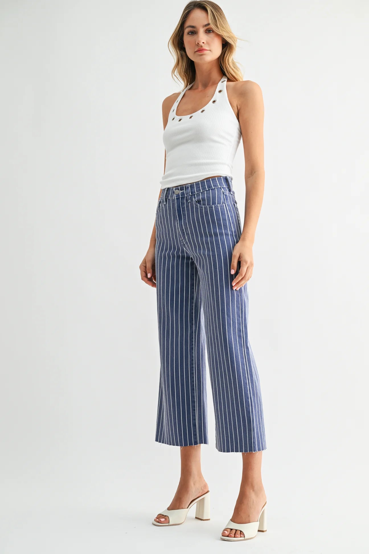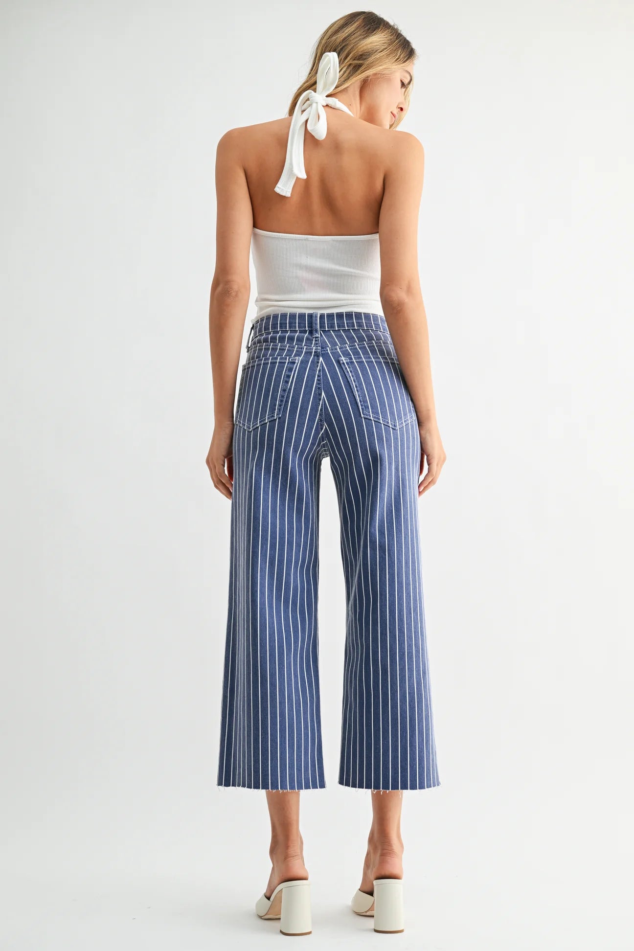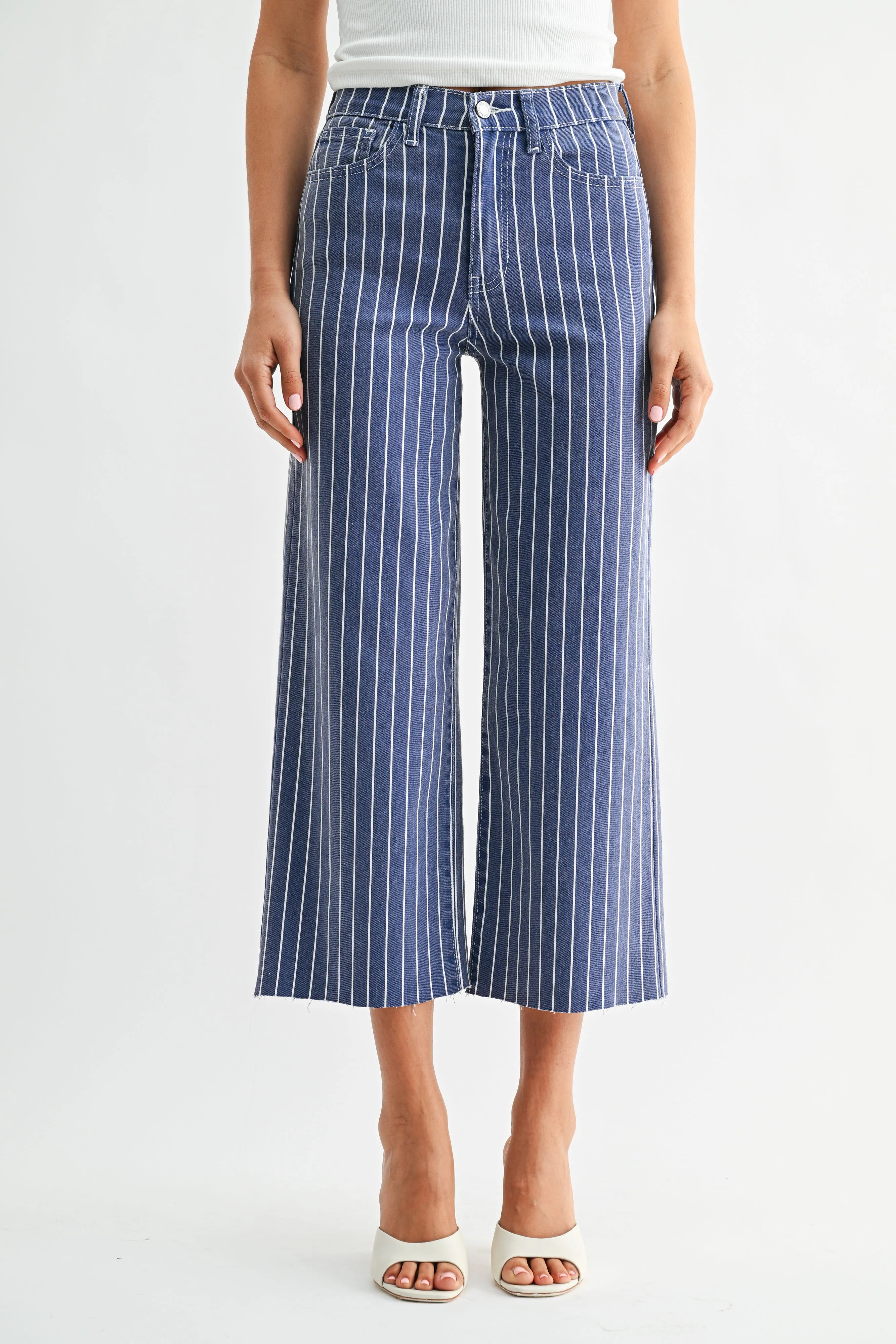 The Scissor Cut Wide Leg Jeans are a cropped, scissor-cut wide-leg pair in striped denim with a raw hem. Made by Just Black Denim, they sit high at the waist and flare from the hip for an easy, retro silhouette. These casual jeans hit above the ankle and pair effortlessly with sandals or heels for daytime outfits.