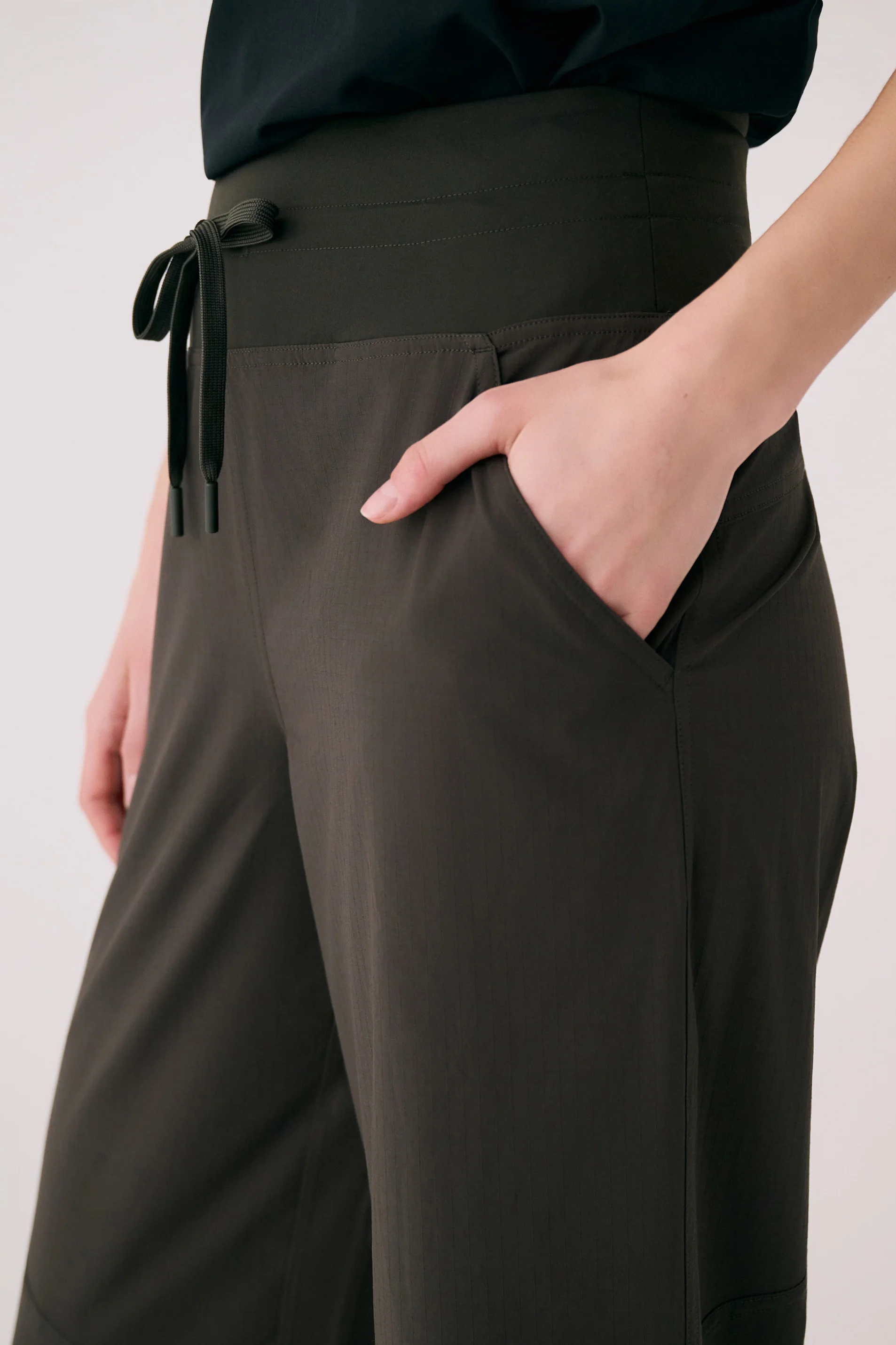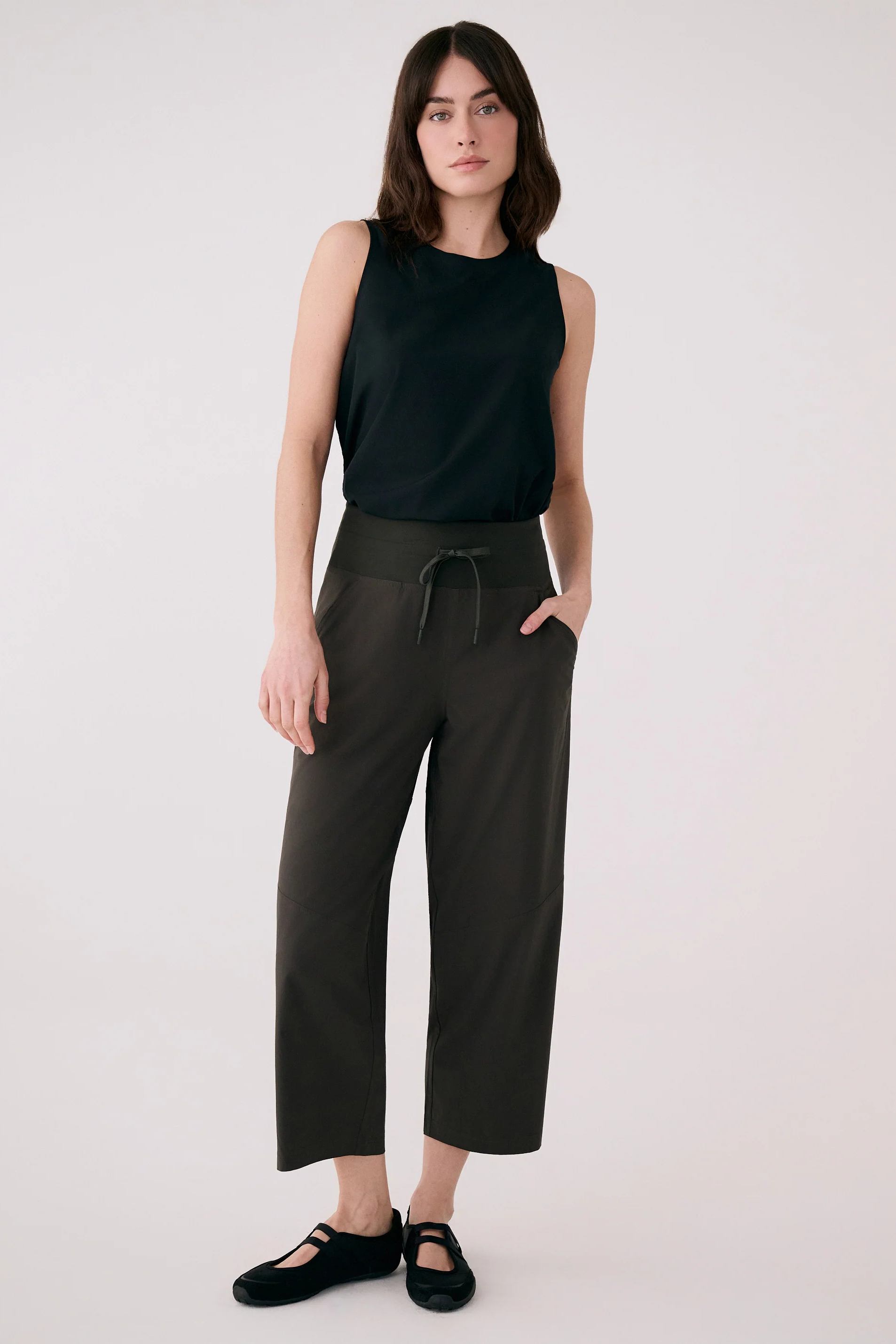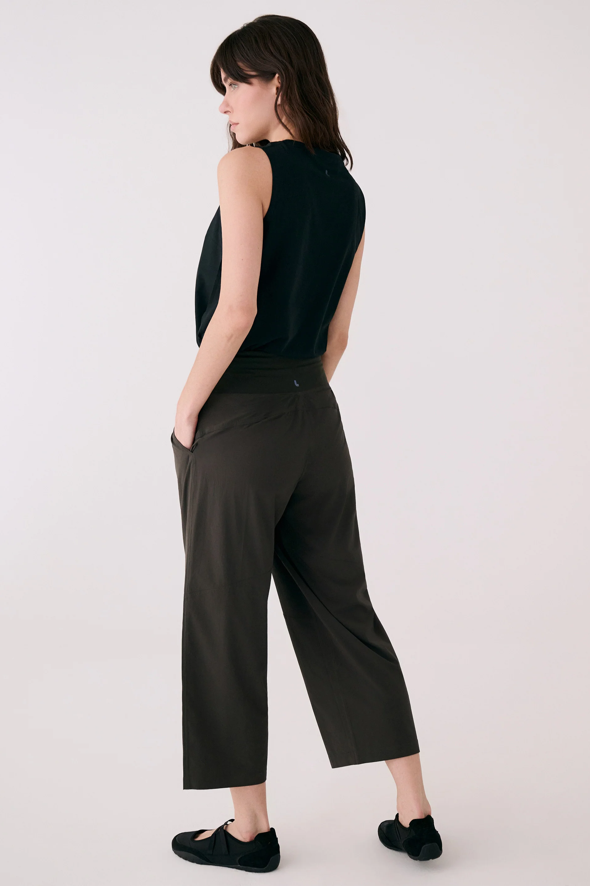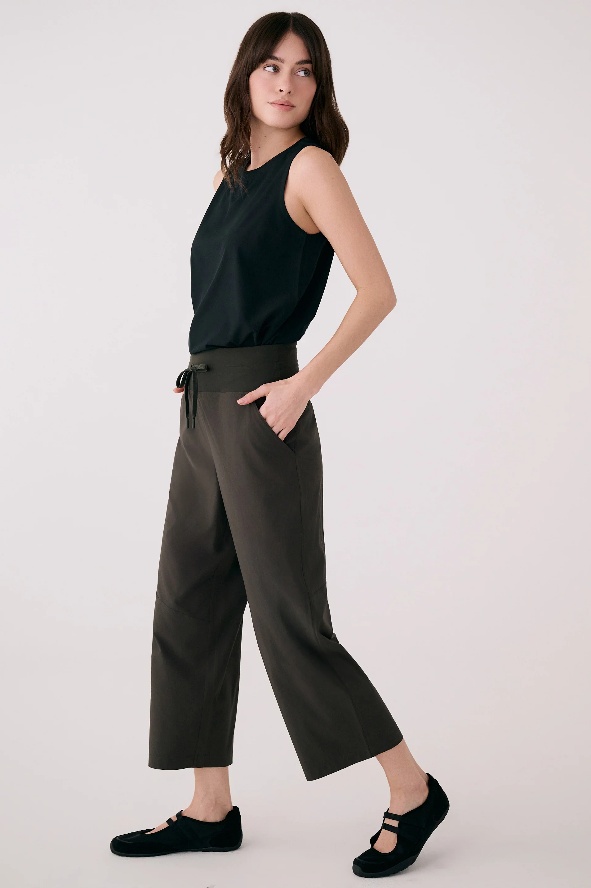 The Sofia Crop Pant is a cropped, wide-leg pant with a high, elasticized drawstring waist for a polished yet relaxed fit. It has a straight, slightly cropped silhouette that hits above the ankle and features side pockets for everyday ease. Designed for easy movement and casual wear, the smooth technical fabric gives a neat, travel-friendly finish. This style is offered by Lole and pairs well with tanks or lightweight blouses for versatile seasonal outfits.