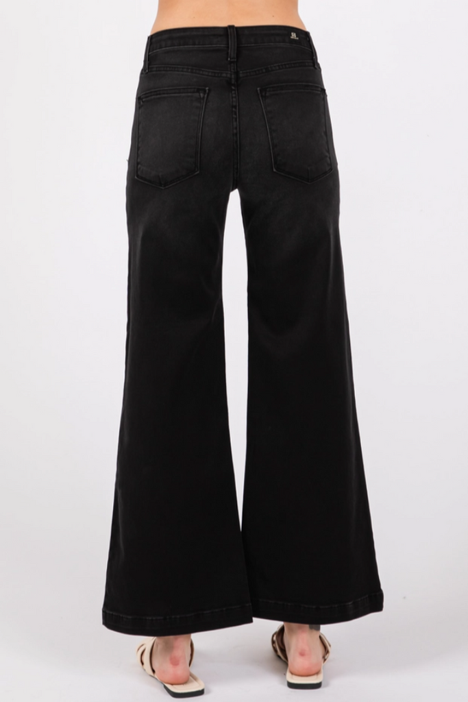 These chic black culotte-style jeans feature a relaxed wide-leg silhouette that hits at a flattering cropped length just above the ankle. The high-waisted design with classic five-pocket styling creates a sophisticated take on casual denim, offering the comfort of wide-leg pants with the timeless appeal of jeans. Perfect for creating effortlessly polished looks that transition seamlessly from day to evening.