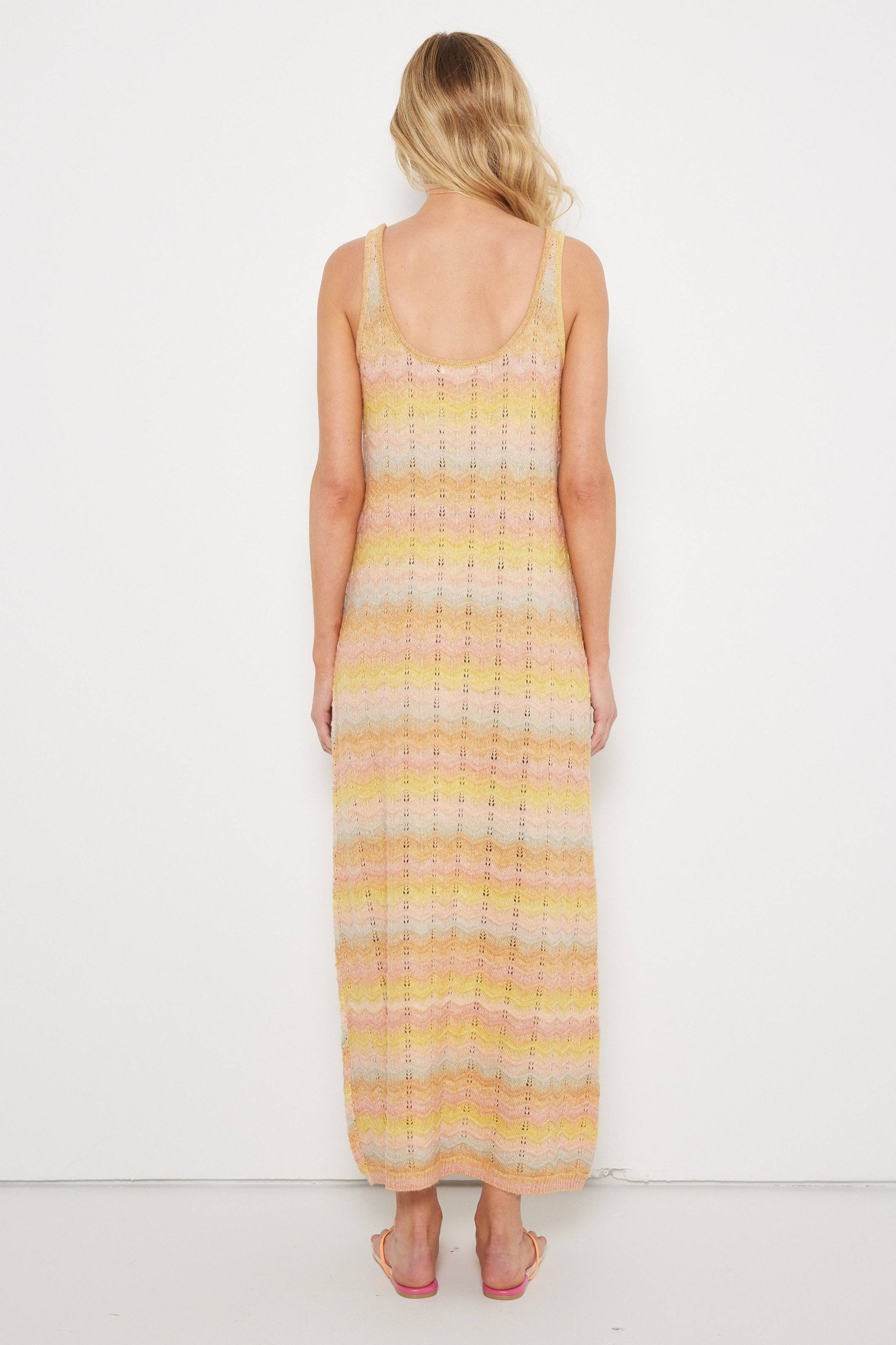 Made from a soft Cotton blend in a dreamy colored chevron pattern and pointelle stitch; the Summerscape sleeveless scoop neck maxi dress will be your new Spring go-to.