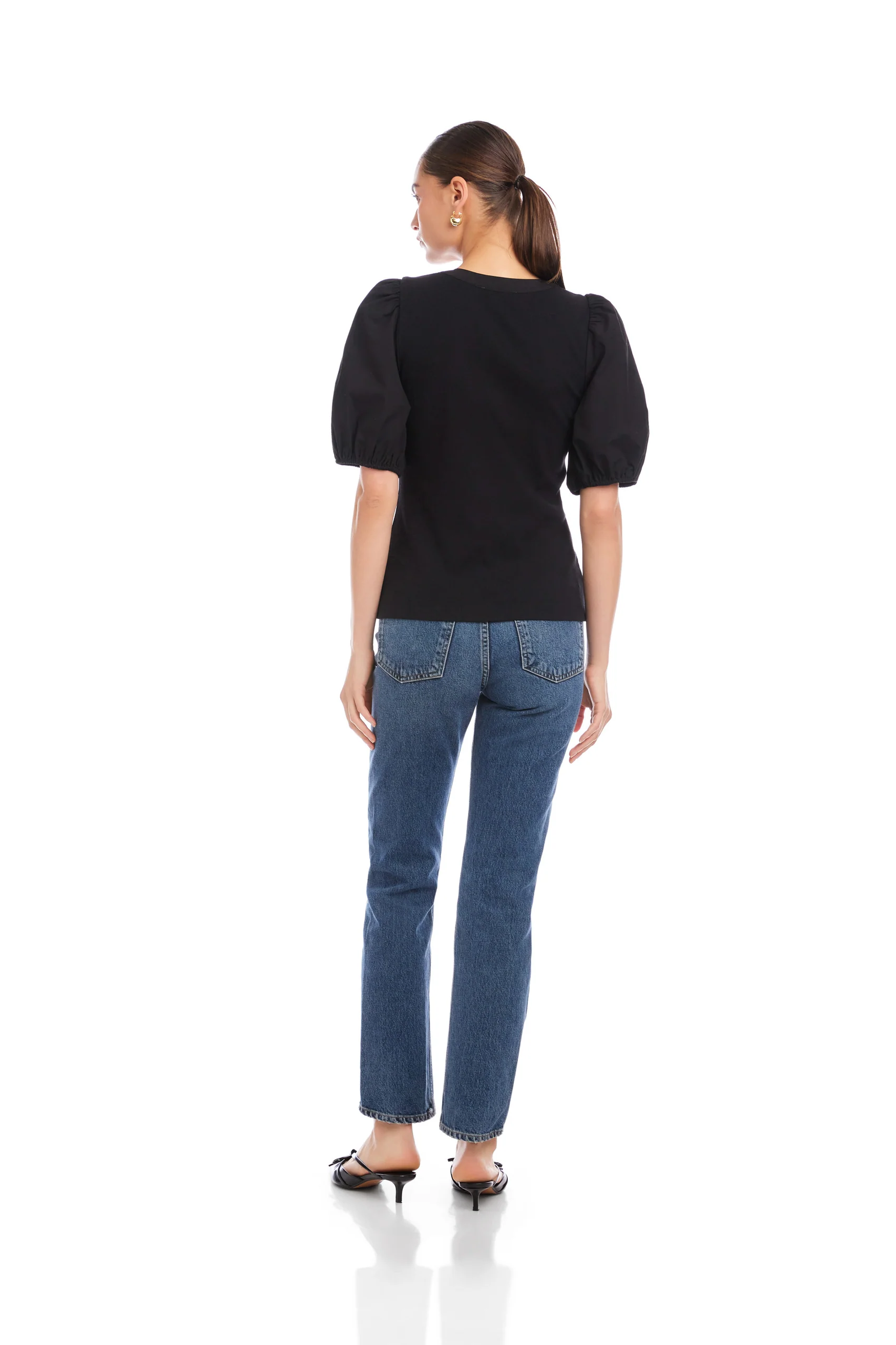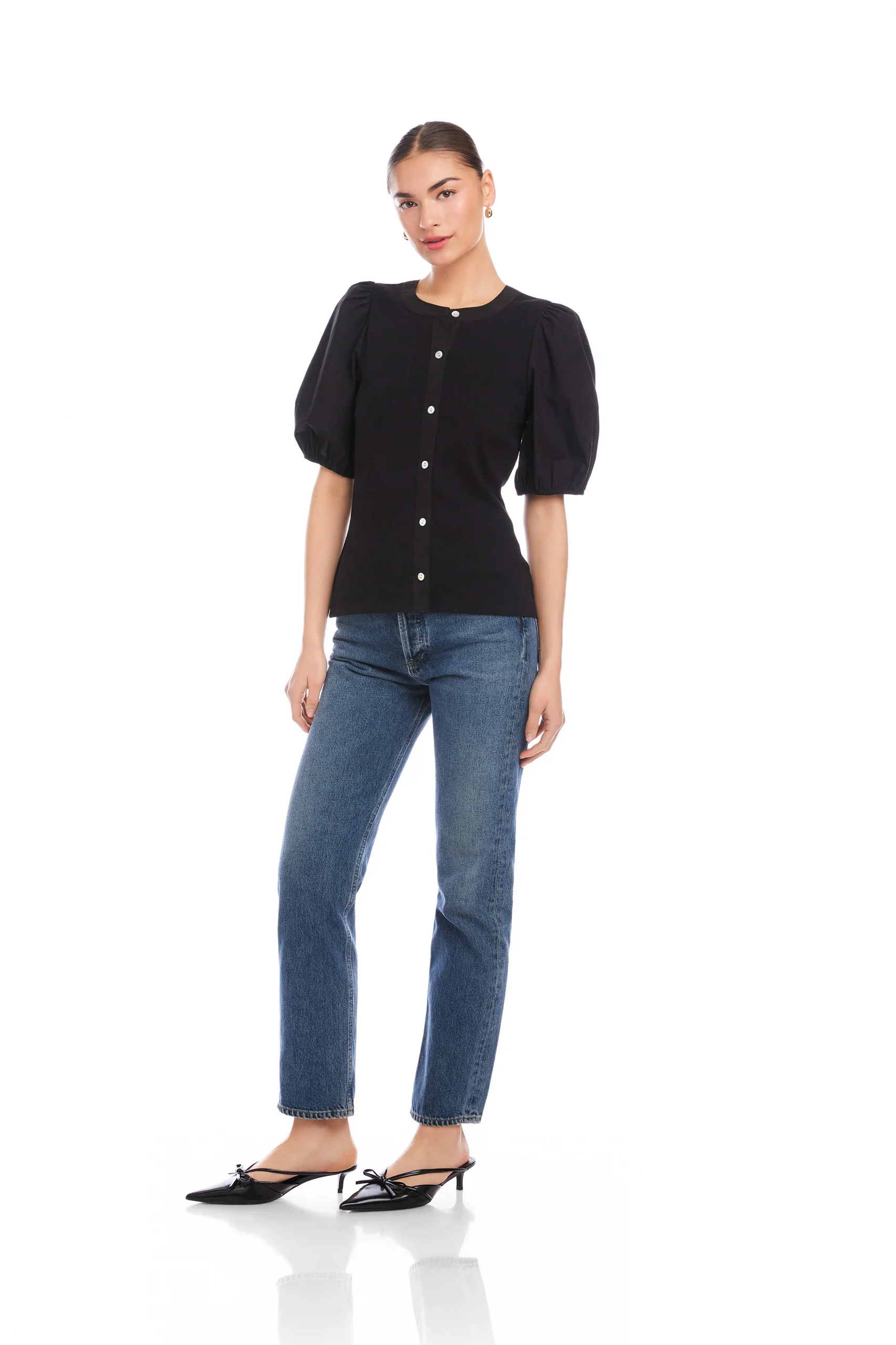 Tailored through the body with structured puff sleeves that add soft volume at the shoulders.