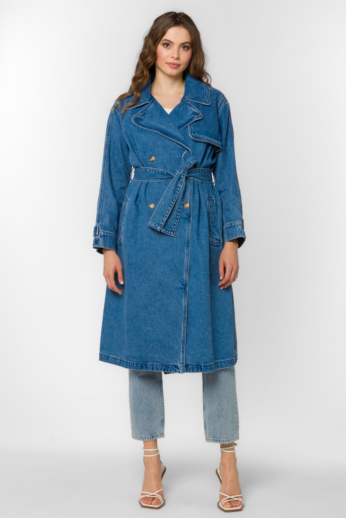 The Banks Trench Coat is a timeless wardrobe staple with a modern twist. This long-sleeve, double-breasted denim trench features a self-tie belt for a flattering fit. Crafted from soft, durable denim, it offers both structure and ease, making it a versatile layering piece for any season.