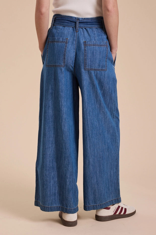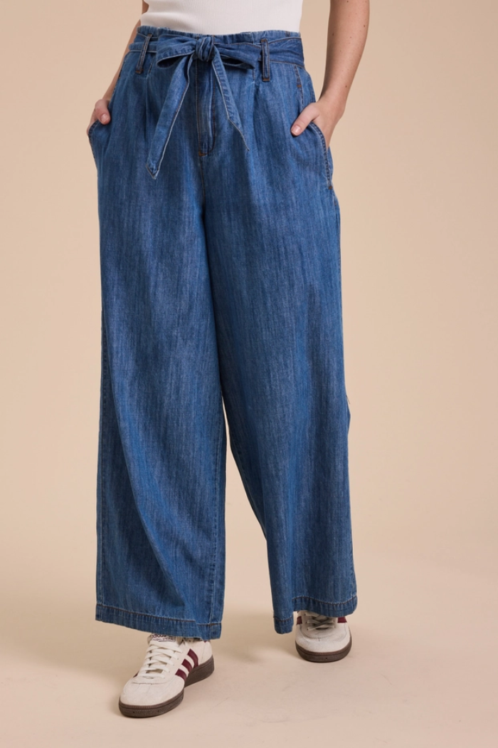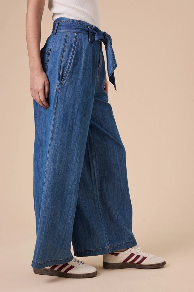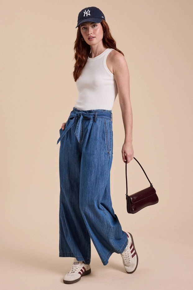 These relaxed wide-leg denim pants offer effortless comfort with their flowing silhouette and soft chambray-like construction. The high-waisted design features a flattering tie-waist belt that cinches at the natural waistline, while the dramatically wide legs create beautiful movement and a breezy, palazzo-inspired shape. The medium blue wash and lightweight denim fabric give these pants a casual sophistication that's perfect for warm weather styling. With practical side pockets and an easy pull-on design, these versatile pants transition seamlessly from leisurely weekend brunches to casual office days, offering both comfort and contemporary style in one effortless piece.
