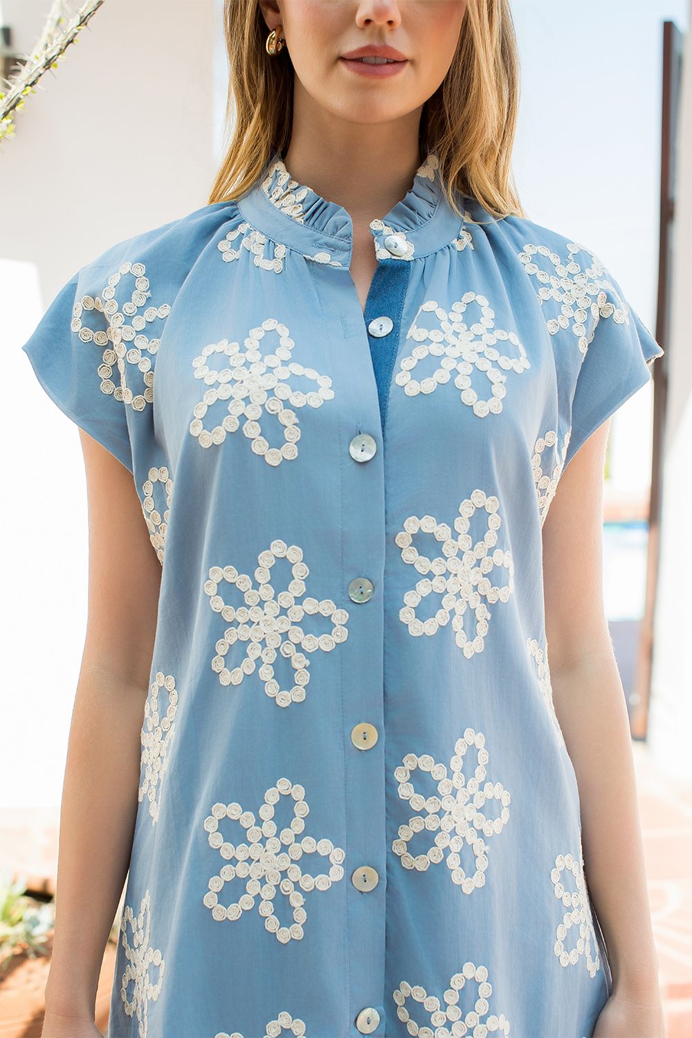 Capture effortless summer elegance in this charming powder blue shirt dress adorned with delicate white floral embroidery that creates a fresh, garden-inspired aesthetic. The classic button-front design and relaxed short sleeves offer timeless appeal, while the lightweight fabric and easy A-line silhouette ensure comfortable all-day wear. Perfect for warm-weather occasions, this versatile piece combines feminine charm with casual sophistication for a look that's both polished and breezy.