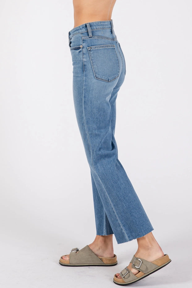 These high-waisted cropped flare jeans offer a modern take on retro styling with their flattering silhouette and versatile length. Featuring a classic five-pocket design and button-fly closure, these jeans sit high on the waist to elongate the legs before flowing into a subtle flare from the knee down. The cropped ankle length creates a contemporary finish that's perfect for showcasing your favorite shoes, while the medium blue wash and clean construction make them easy to dress up or down. The timeless flare shape combined with the cropped hem creates a fresh, effortless look that pairs beautifully with everything from fitted tees to flowing blouses.